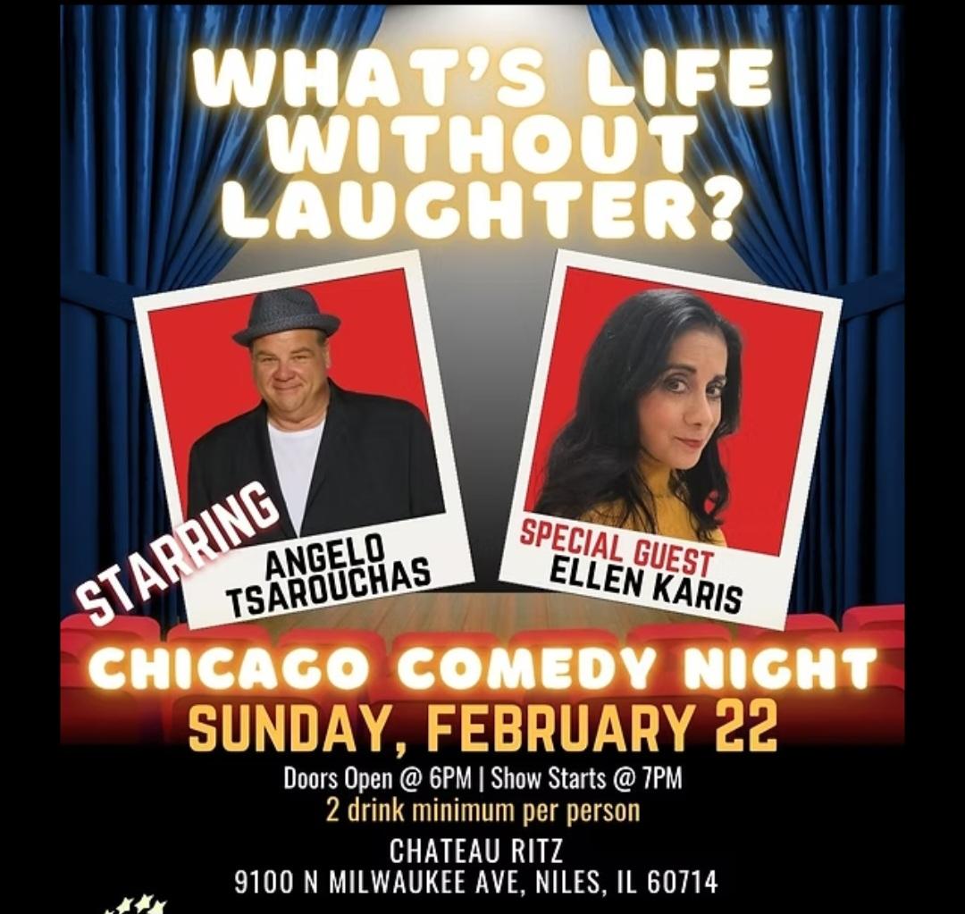 Chateau Ritz Banquets in Niles welcomes everyone to enjoy Greek comedians Angelo Tsarouchas and Ellen Karis for a great night of entertainment and laughs.