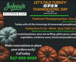 Johnny's Kitchen and Tap in Glenview will be open Thanksgiving Day (11am-8pm) offering their famous Traditional Thanksgiving Feast and special to-go package.